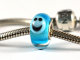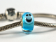 This bead has an aqua blue core, encased in clear glass and finished with three light blue smiley faces. It has a sterling silver core (not glued in rivets) and is made to fit most European charm bracelets. It measures 14 x 8mm, hole = 4.3mm.
