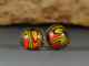 Matching pair of lampwork beads, red, mustard yellow and black design, encased in clear. They measure approx 13mm diam x 10.5mm.