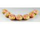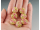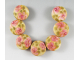 These seven beads have a yellow base, topped with pink flowers and olive green variegated leaves. They measure approx 16mm in diameter and 7mm thick. They have been etched to give a matte finish. They were made on 1/16” mandrels and were properly kiln annealed.